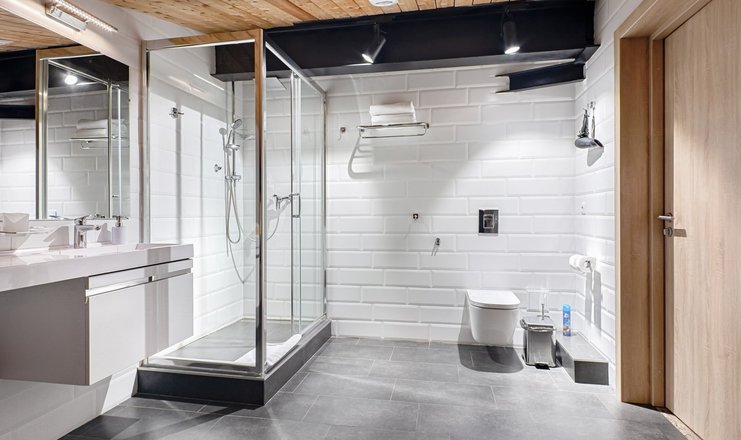 Санузел: с душевой кабиной, тапочки, туалетные принадлежности, фен, халат