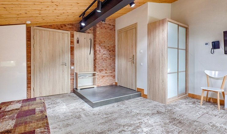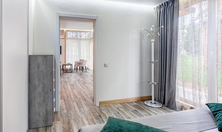 В номере: вешалка, диван раскладной, кровать двуспальная, кровать двухъярусная, кухонная мебель, прикроватные тумбочки, стол, стулья, тумба под телевизор, шкаф, микроволновая печь, плита электрическая, телевизор, холодильник, чайный набор посуды, электрочайник