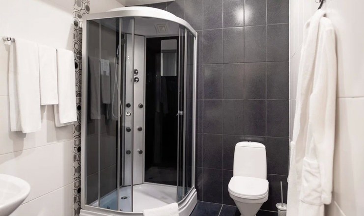 Санузел: с душевой кабиной, тапочки, туалетные принадлежности, фен, халат